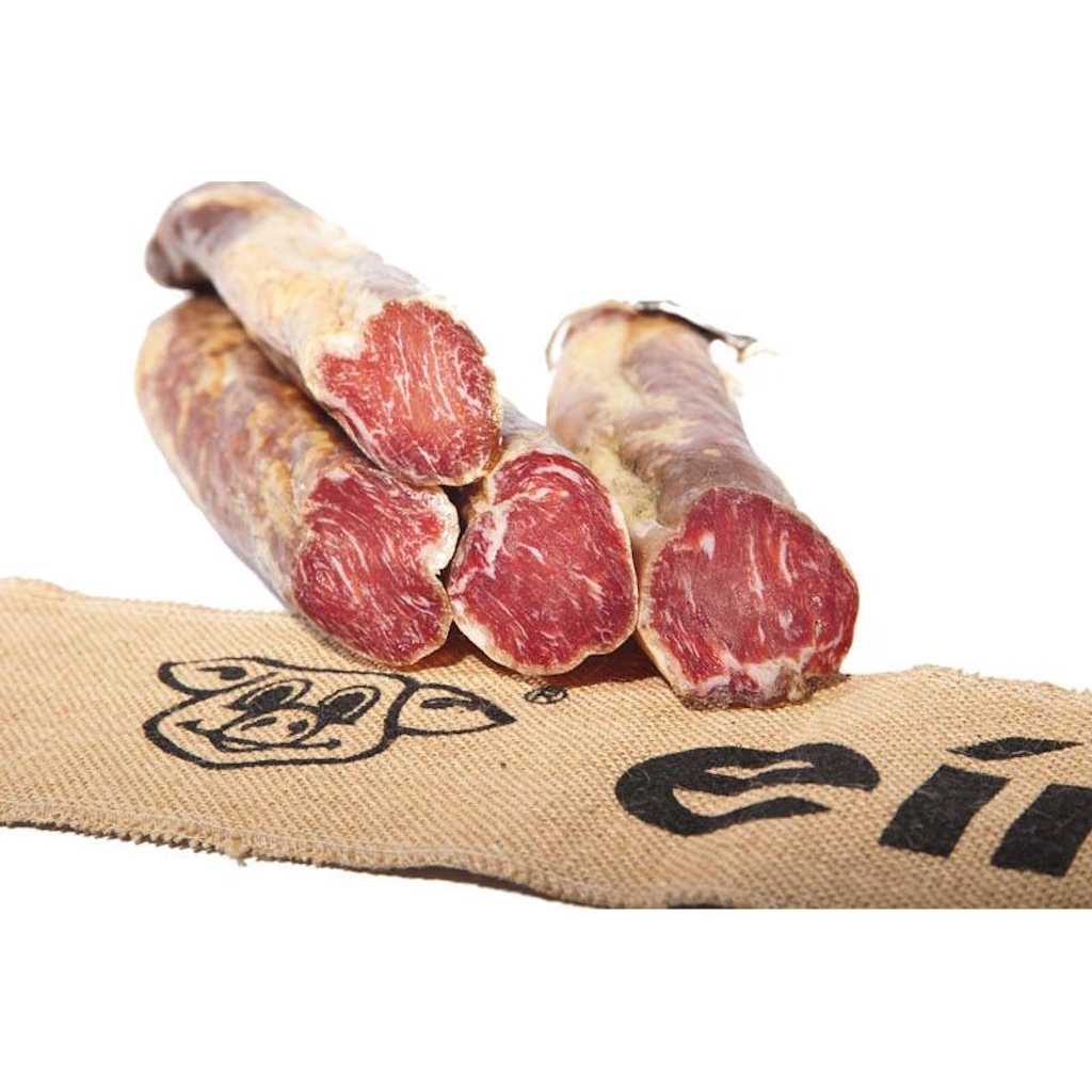 La Caña de Lomo de Bellota 100% Ibérique Classique d’Eíriz est élaborée de manière artisanale à partir de porcs élevés en liberté. Suivant la recette familiale, elle est assaisonnée de paprika de la Vera et d’épices naturelles, puis affinée dans un boyau naturel à Corteconcepción.